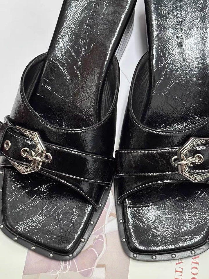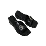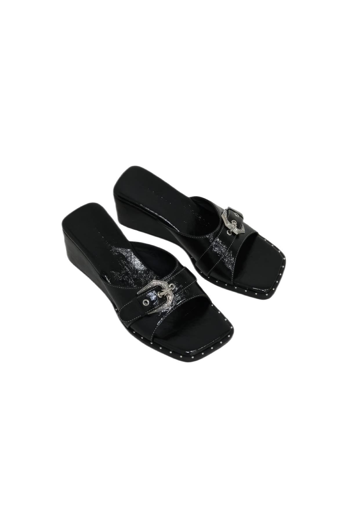 The Buckle Wedge Slides are designed with a sculpted wedge heel and square toe for a sharp, modern look. Made from waxed PU with a glossy finish, they feature a front strap with a silver metal buckle detail. The cushioned insole and stable platform sole make them comfortable for everyday wear while keeping an elevated shape.