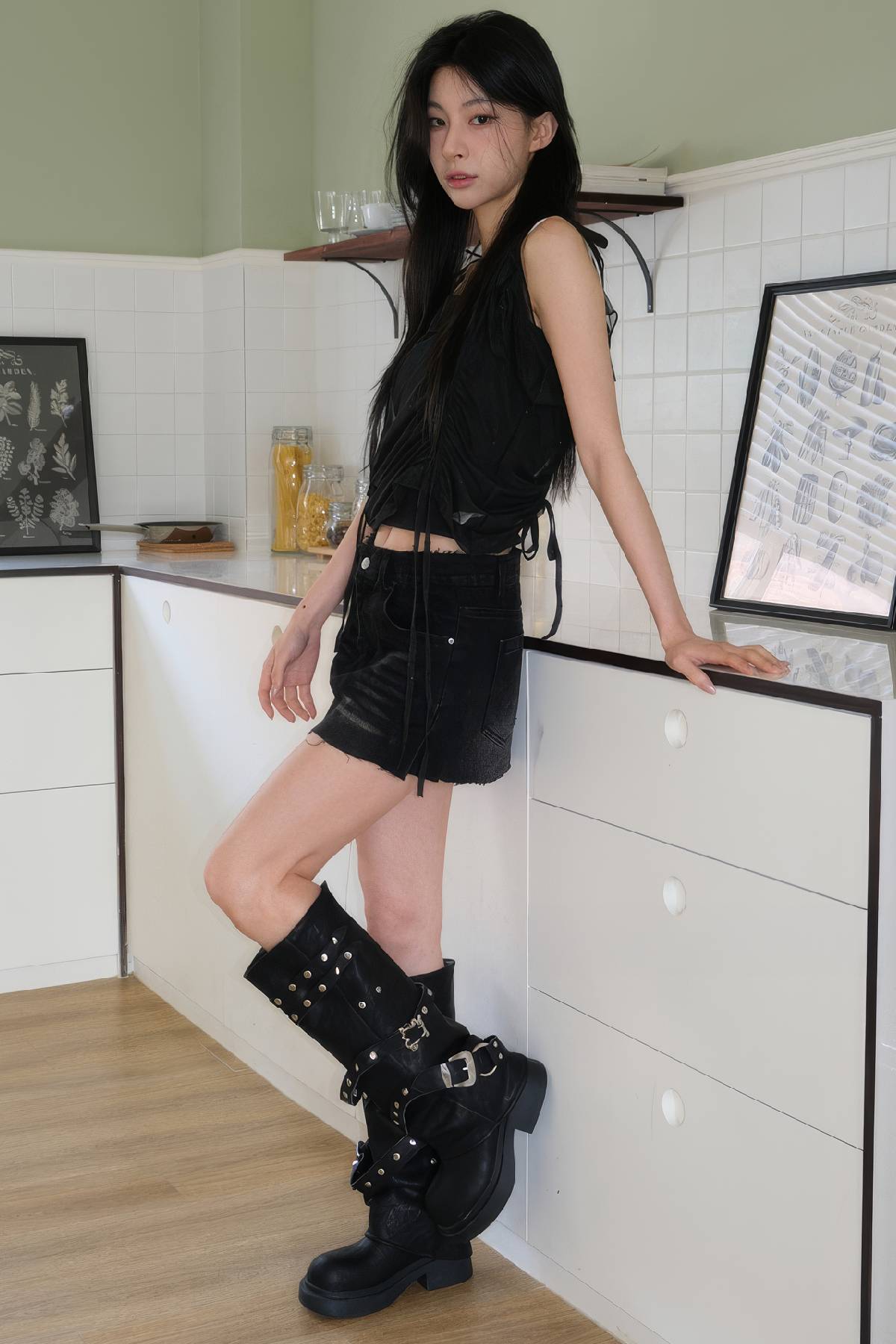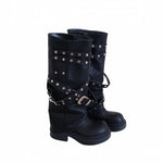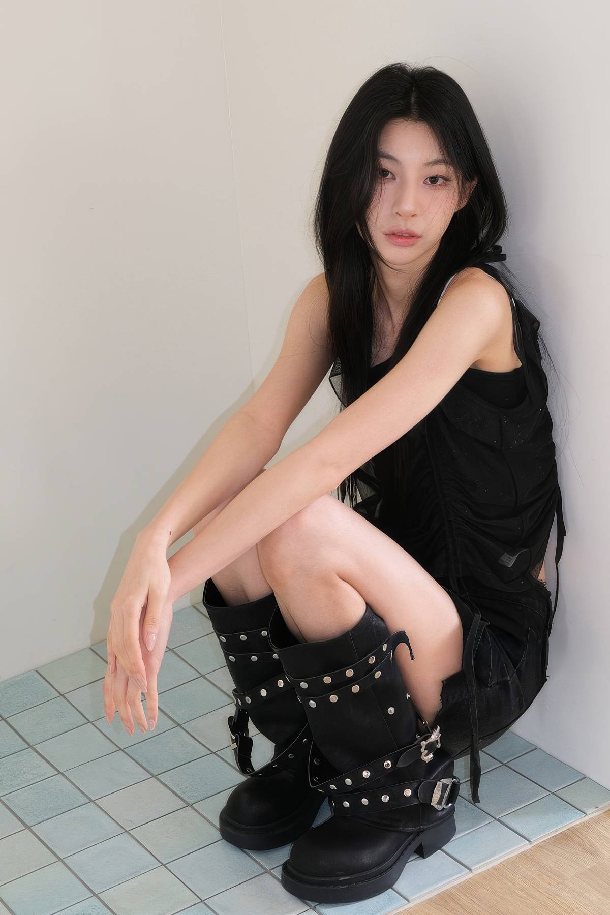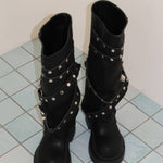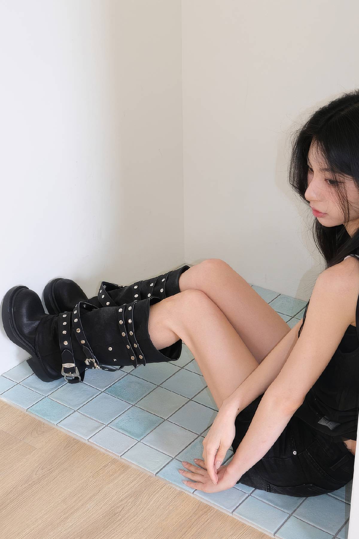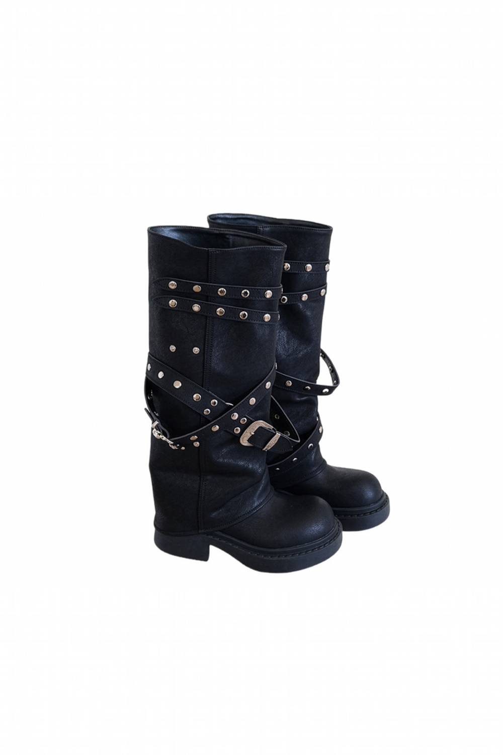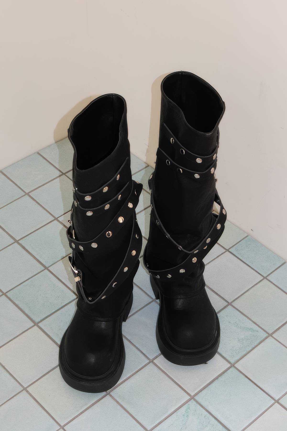 The Raze Stud Strap Boots combine a tall, structured shaft with bold metal detailing. Made from durable PU leather, they feature layered buckle straps and rivet accents wrapping around the leg for a striking silhouette. The round toe and platform sole balance height with comfort, making them stand out while staying wearable for everyday looks.